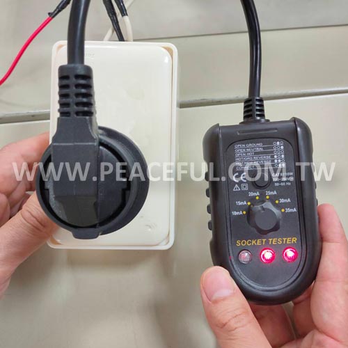 This is a portable 220VAC socket tester to inspect the wiring conditions.The tester also features current variation for simulation of different leaking current. With the current variation, technician is able to test the condition of Ground Fault Circuit Interrupter(GFCI) / Residual Current Device (RCD)easily.