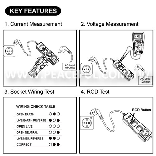 This tester combines a RCD tester and an AC line splitter in one tool. Key functions: