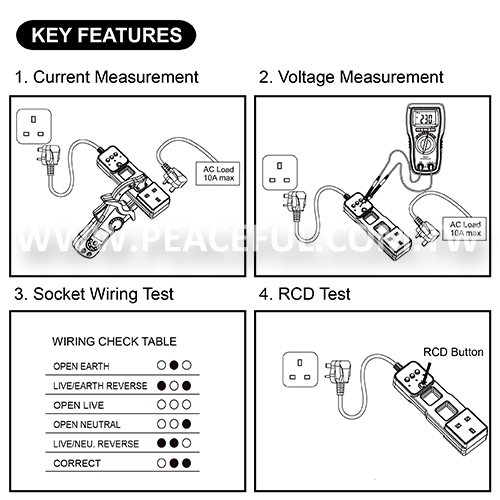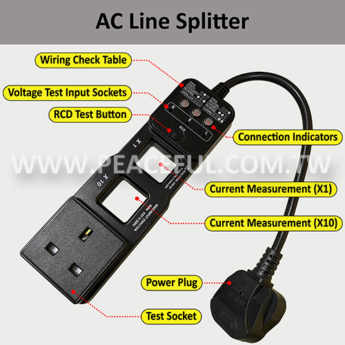 This tester combines a RCD tester and an AC line splitter in one tool. Key functions: